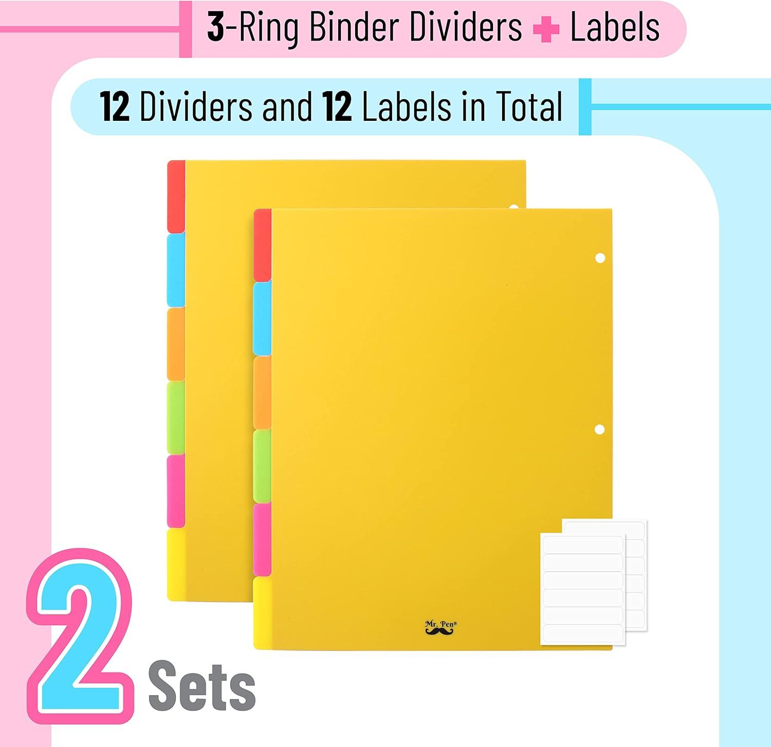 • Mr. Pen 3 ring binder dividers with tabs come as 2 sets of 6 durable plastic dividers, totaling 12 dividers sized to fit standard letter 3-ring binders.