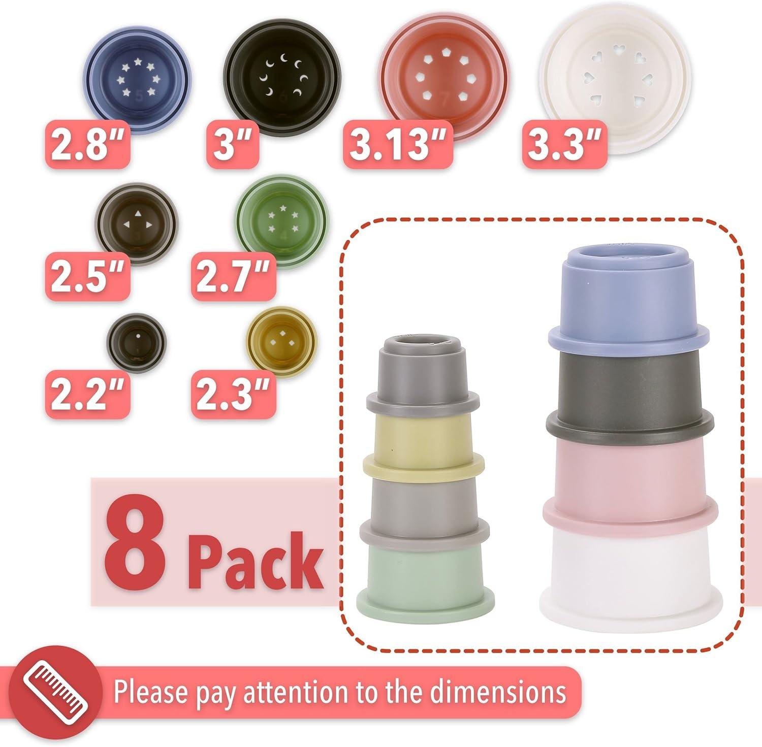 Package includes 8 pcs of stacking cups toy in 8 different colors, which attract babys' attention and promote visual development.