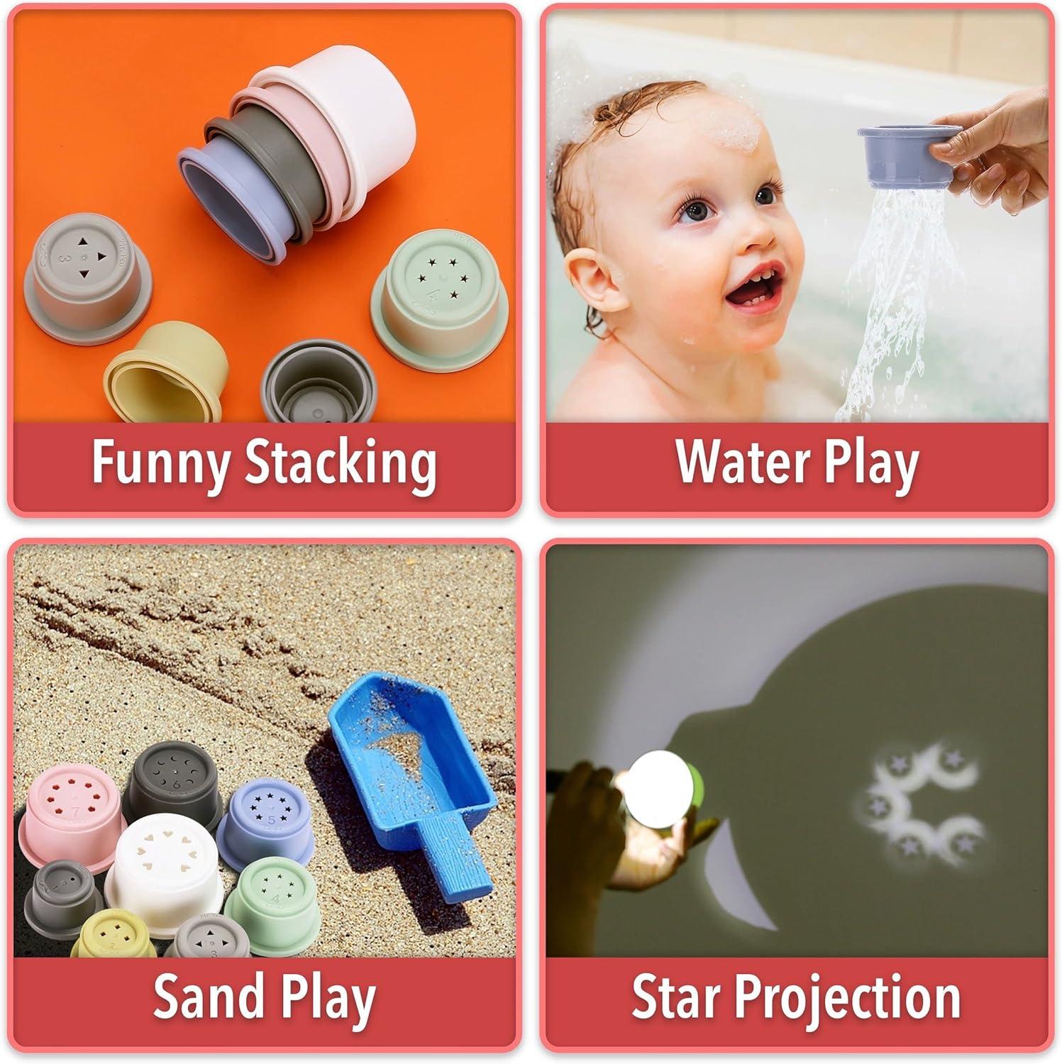 Each cup has hollow geometric patterns on the bottom, so it can be a bath toy or beach toy. These stacking toys can also be a projection tool and give babies lots of fun.