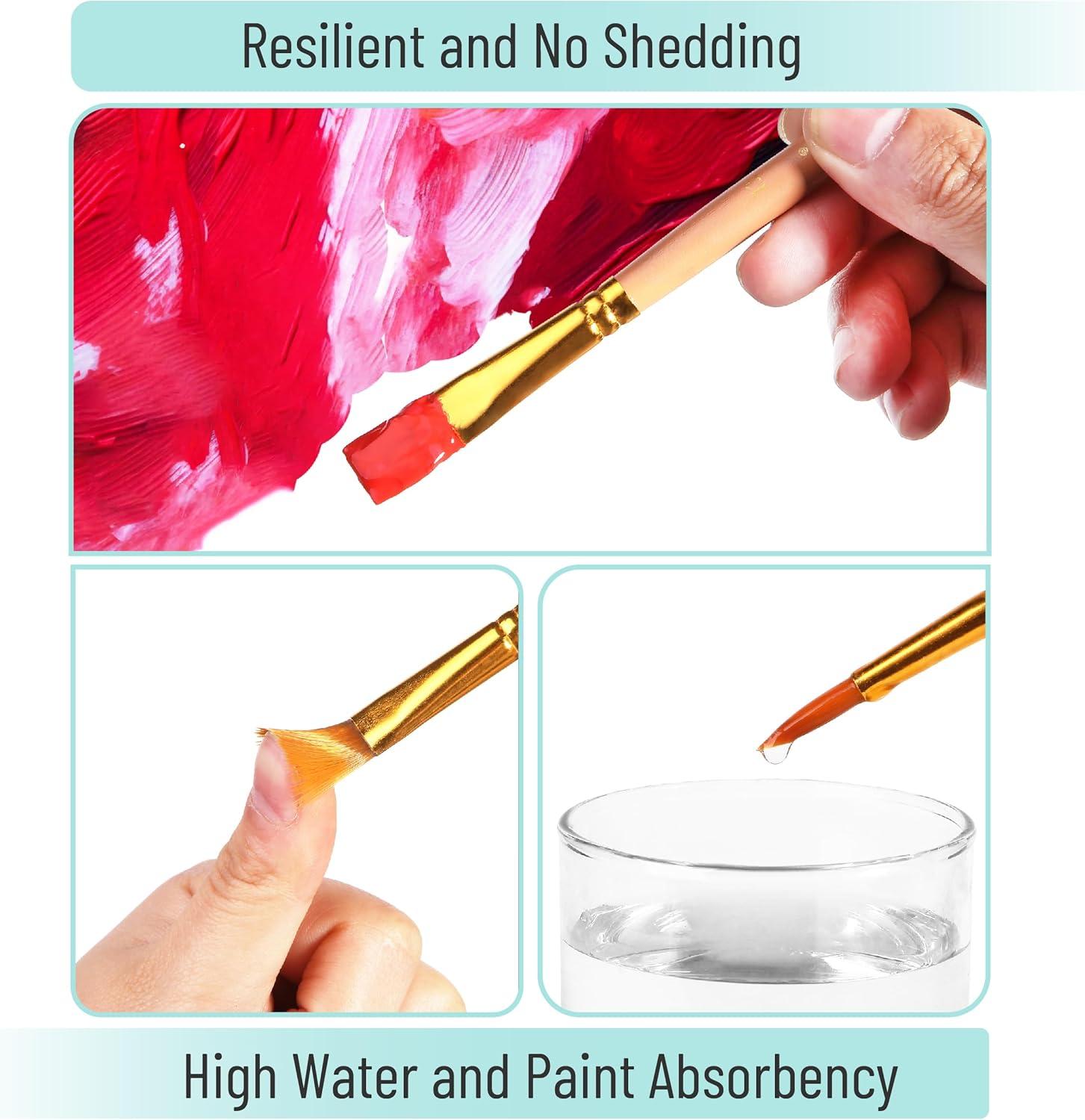 The set includes a variety of shapes—round, flat, filbert, and angular—to support techniques across acrylics, watercolor, gouache, and mixed media projects.