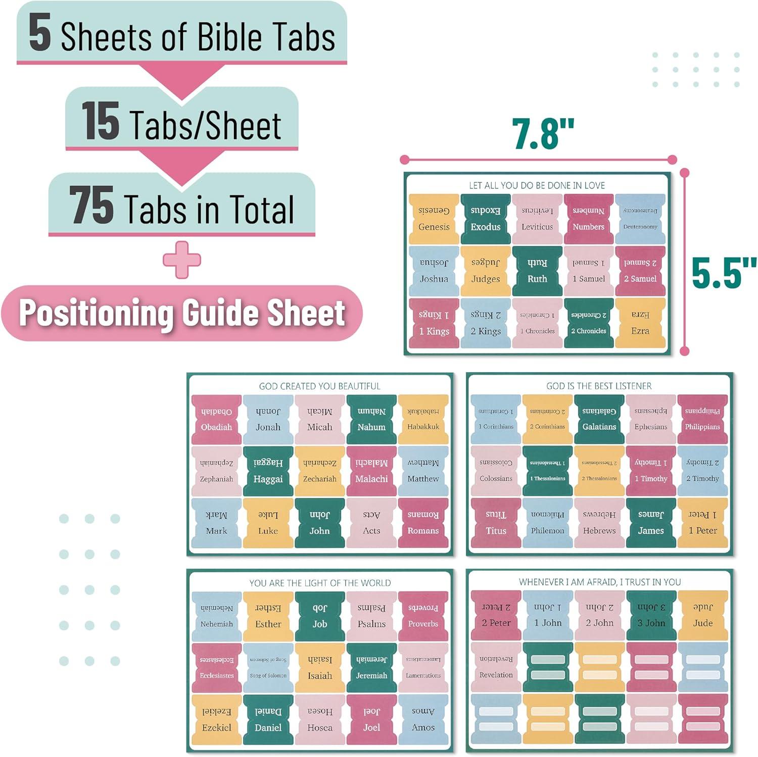 • Make your Bible study more organized and inspiring with Mr. Pen set of 75 Bible tabs! Featuring an assortment of 39 Old Testament books, 27 New Testament books, and 9 blank tabs spread across five sheets.