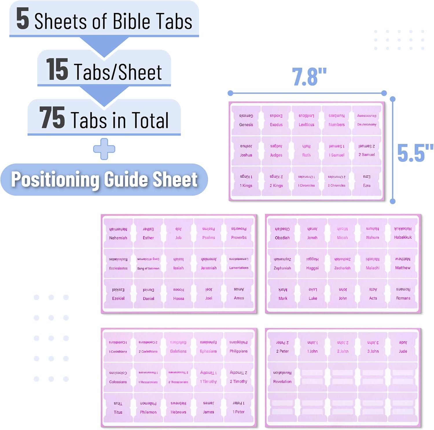 • Make your Bible study more organized and inspiring with Mr. Pen set of 75 Bible tabs! Featuring an assortment of 39 Old Testament books, 27 New Testament books, and 9 blank tabs spread across five sheets.