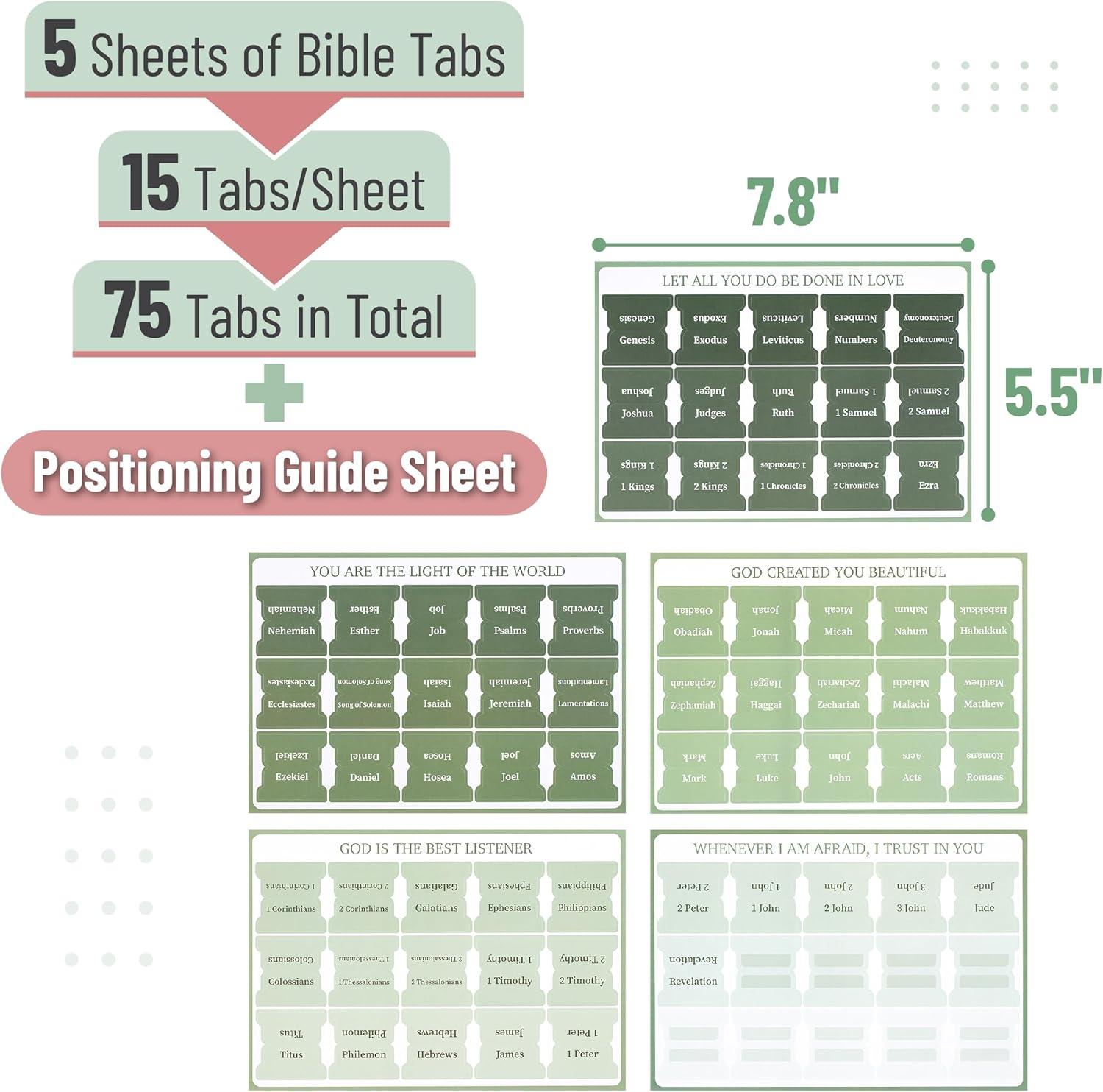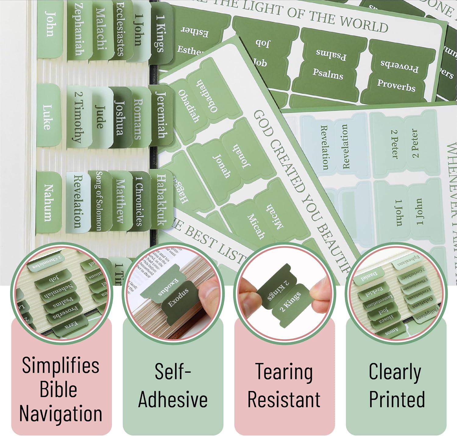 - With their large, clear font and bright printing, these Bible tabs offer a convenient organizational tool for those looking to engage in Bible study or journaling.
