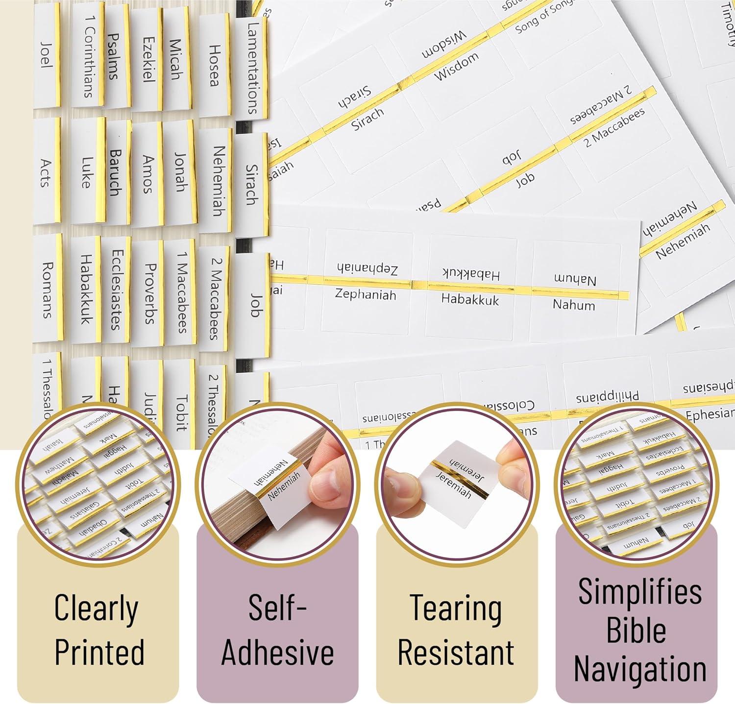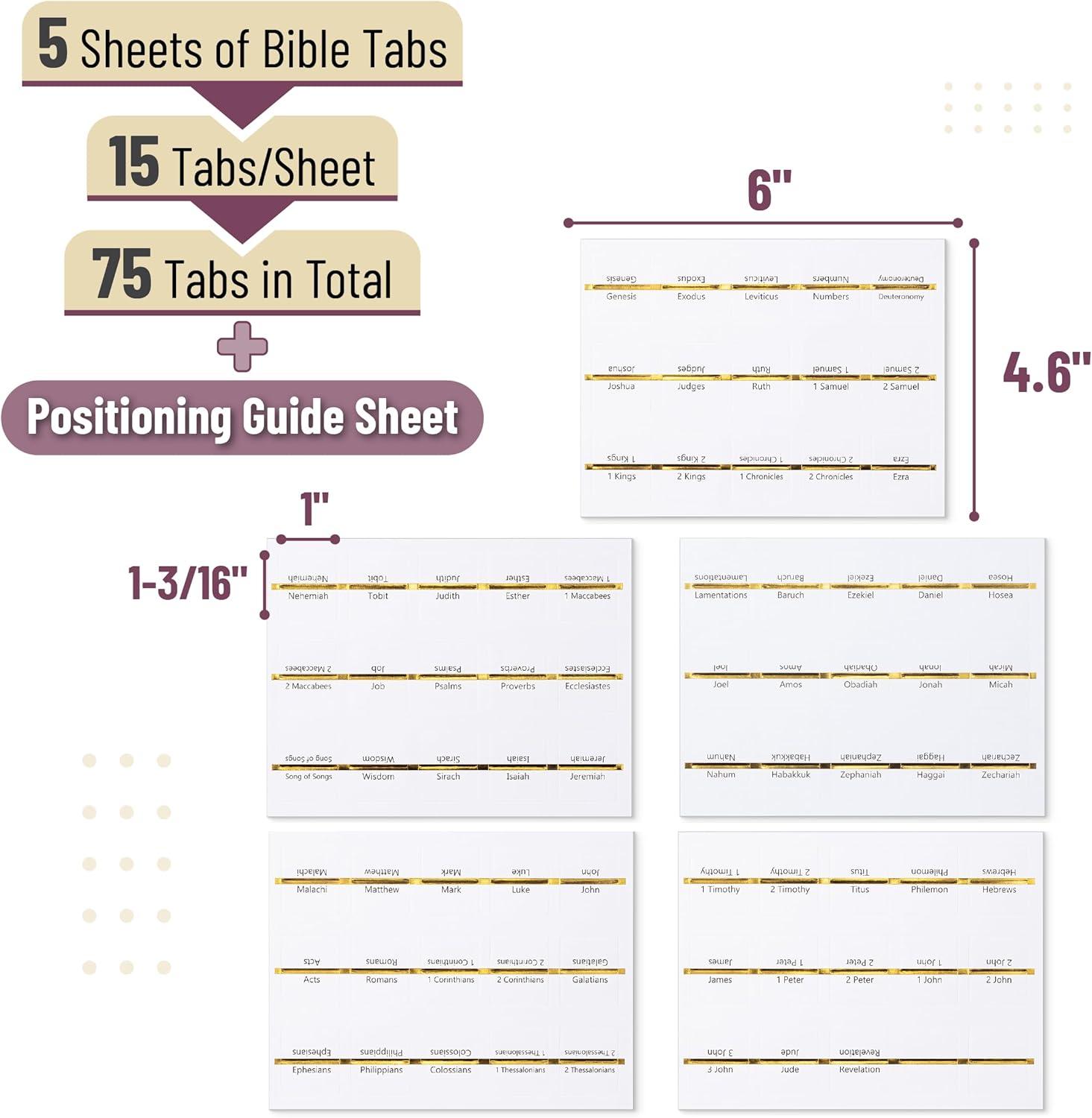 - With their large, clear font and bright printing, these Bible tabs offer a convenient organizational tool for those looking to engage in Bible study or journaling.