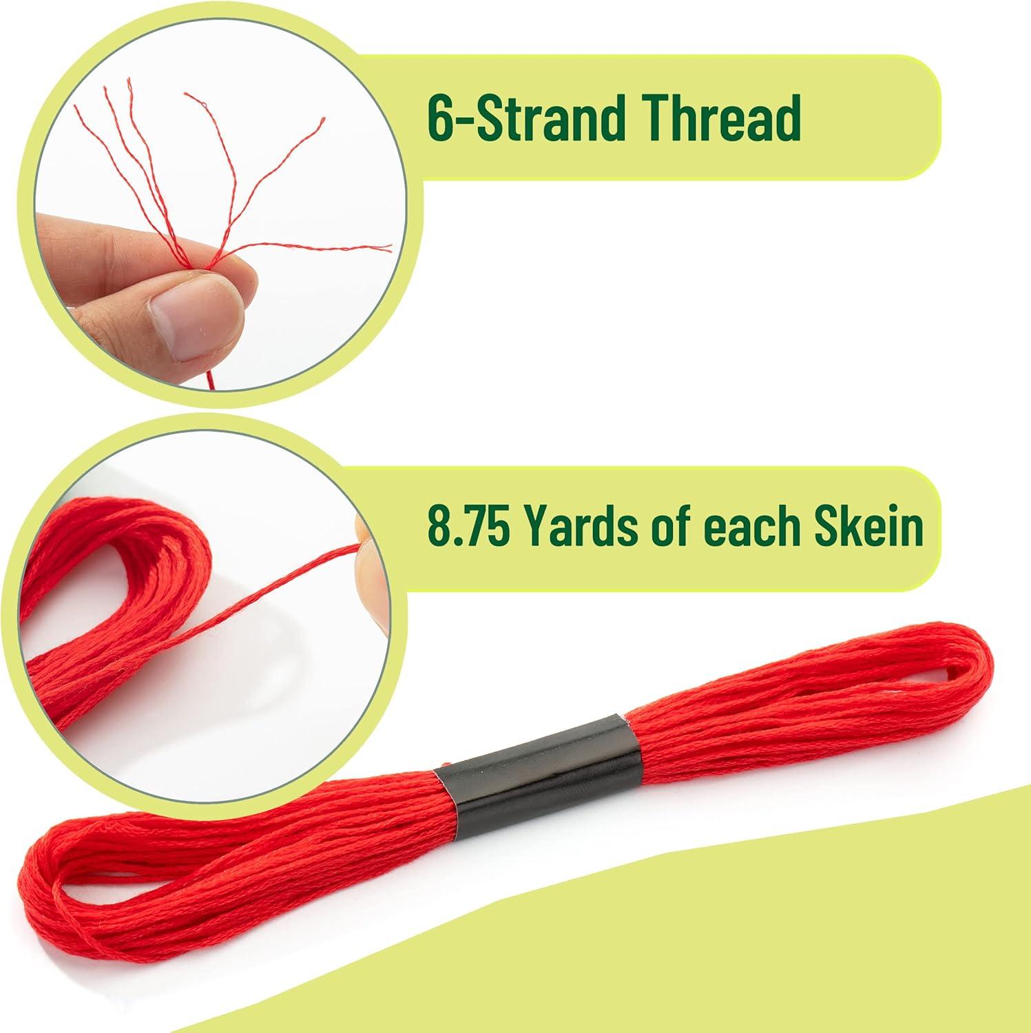 Each thread is about 8.75 yards long, and each skein of embroidery floss consists of a 6-strand thread. Each Floss is tightly packed; just find the line head, and pull it upright without tearing the wrapping paper.