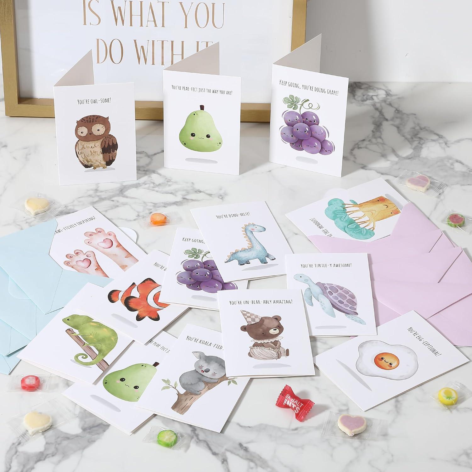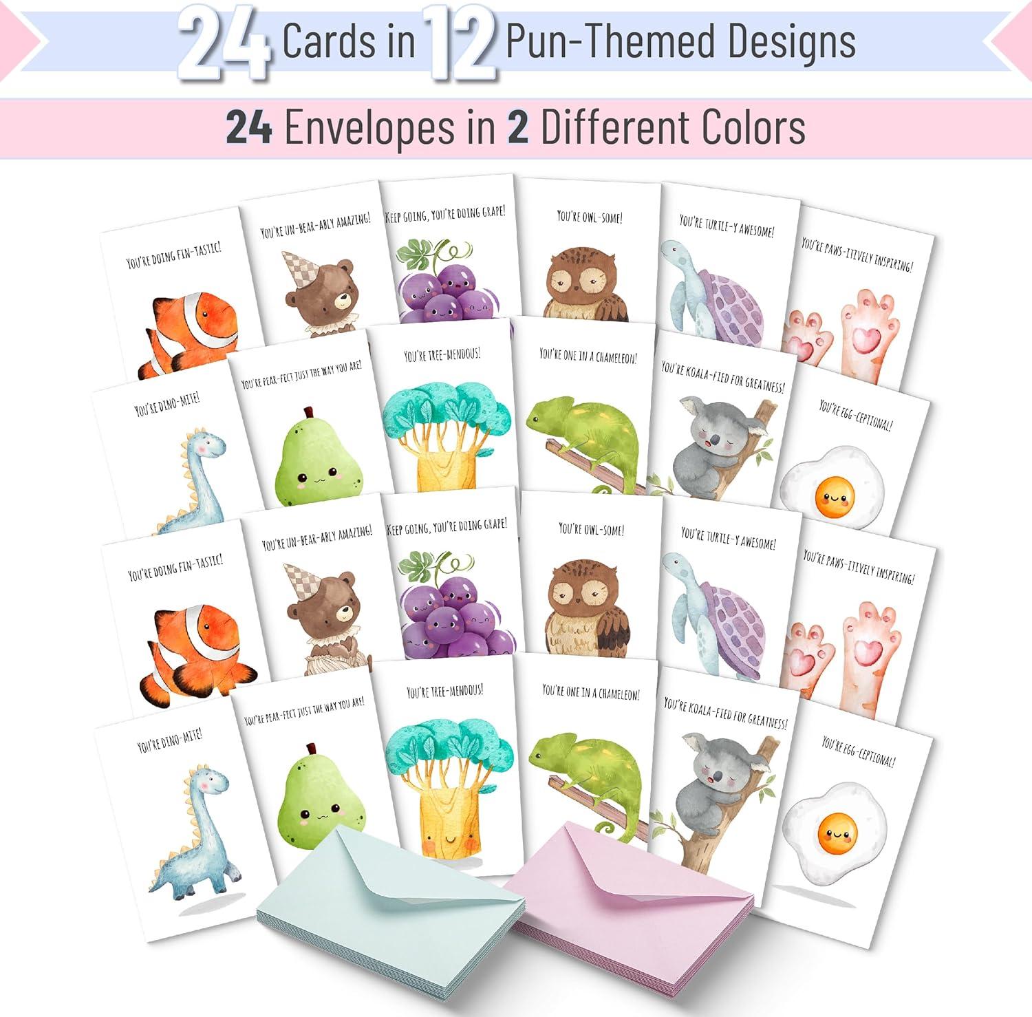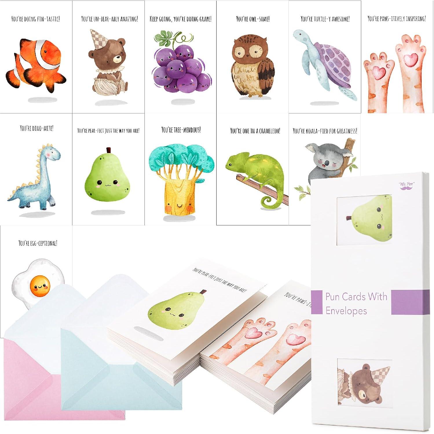 Mr. Pen pun cards set includes 24 cards, featuring 12 delightful array of pun-themed illustrations that are sure to bring a smile to recipients' faces.