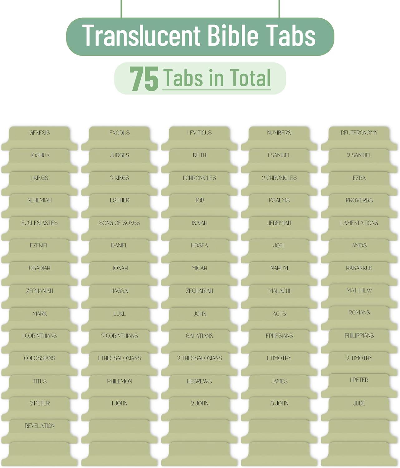 Mr. Pen translucent Bible tabs set includes 75 pre-cut, single-sided tabs covering all books of the Bible, allowing for quick and effortless navigation through each section.