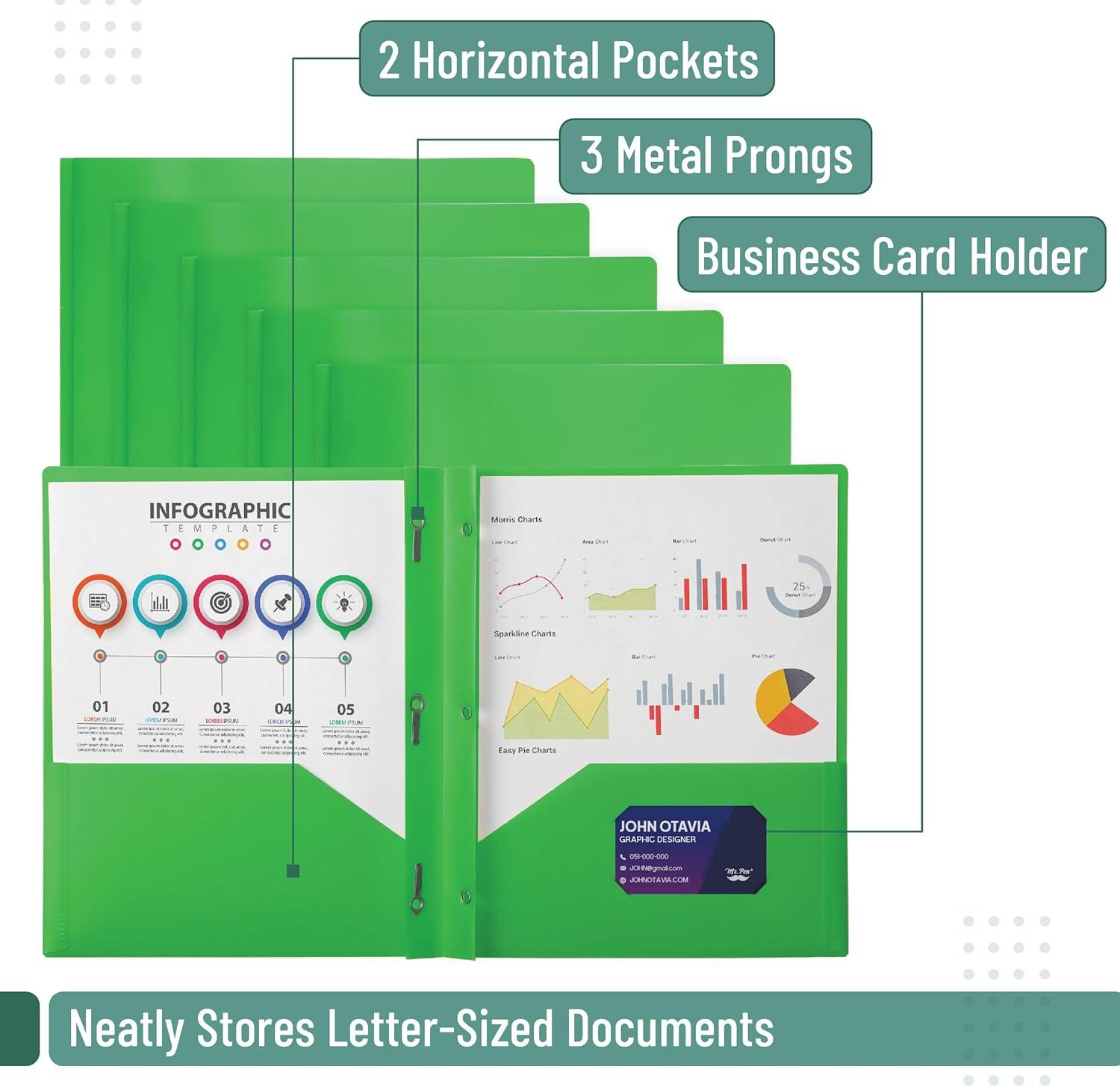 • Each folder is sized for standard letter-size paper and includes two interior pockets and three sturdy prongs for securing loose and punched sheets.