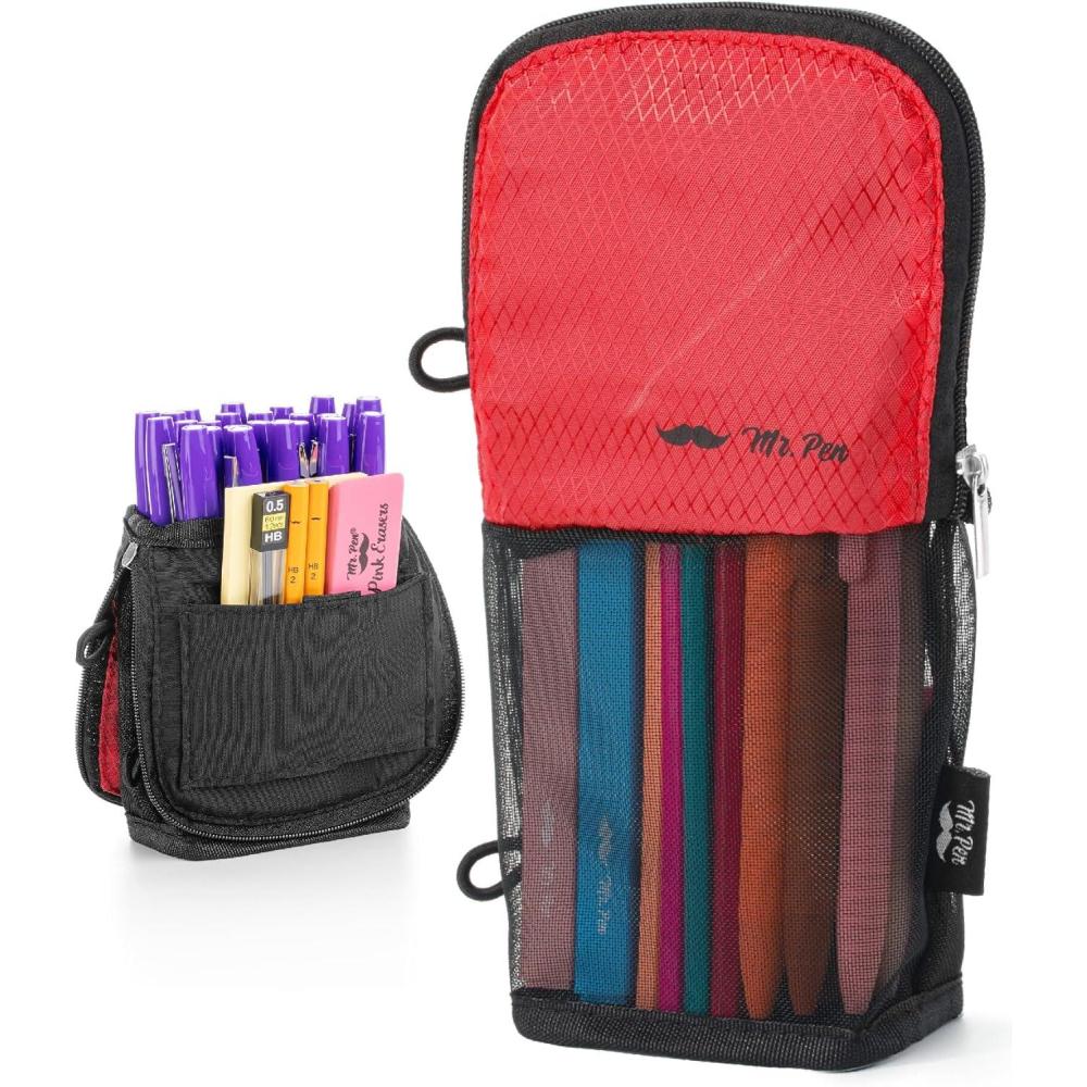 Mr. Pen- Standing Pencil Case Pouch, Sit & Lay Mesh-View Design, Black with Red Zipper, Interior Pocket & 2 Elastic Binder Loops, Cute Pencil Case for Girls and Boys(Black & Red)