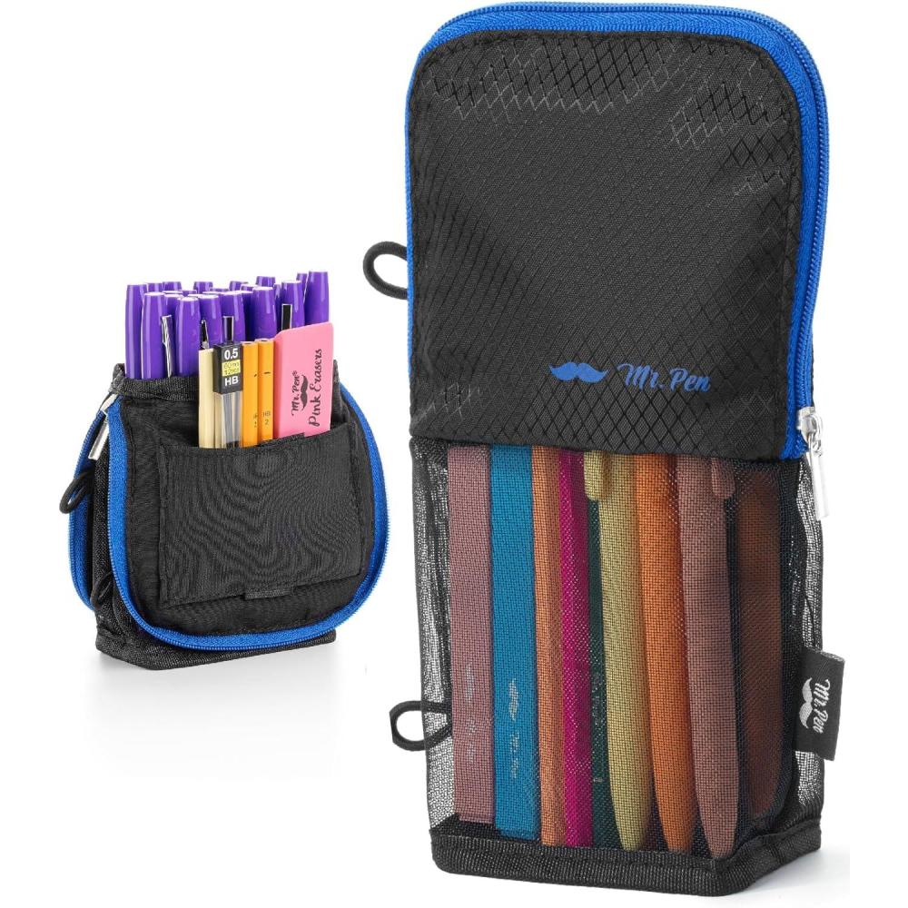 Mr. Pen- Standing Pencil Case Pouch, Sit & Lay Mesh-View Design, Black with Red Zipper, Interior Pocket & 2 Elastic Binder Loops, Cute Pencil Case for Girls and Boys(Black with Blue Zipper)